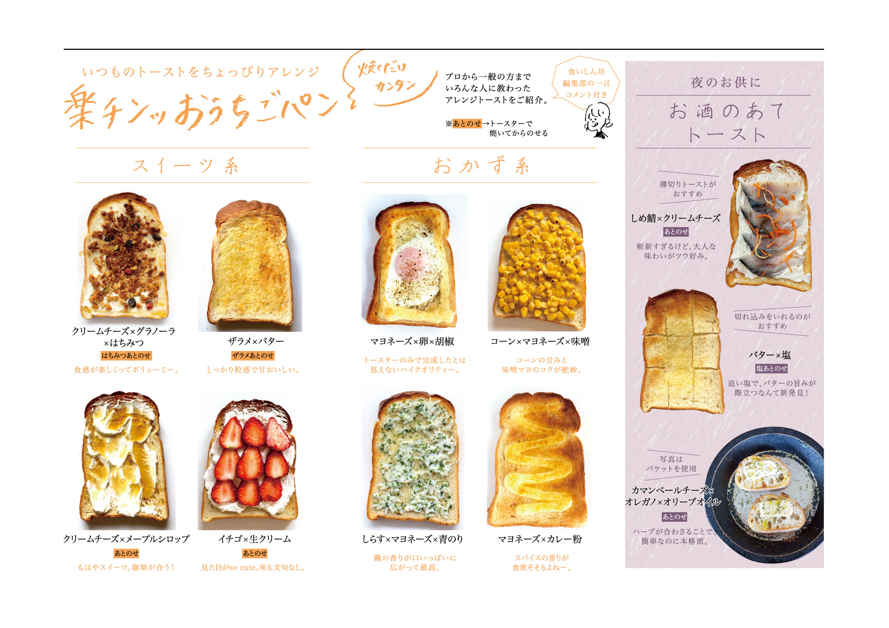 食いしん坊編集部セレクトのお腹も心も大満足なパンをご紹介。手軽にできるトーストアレンジコーナーでは、えっ!?トーストにこれ!?な意外なアレンジも。