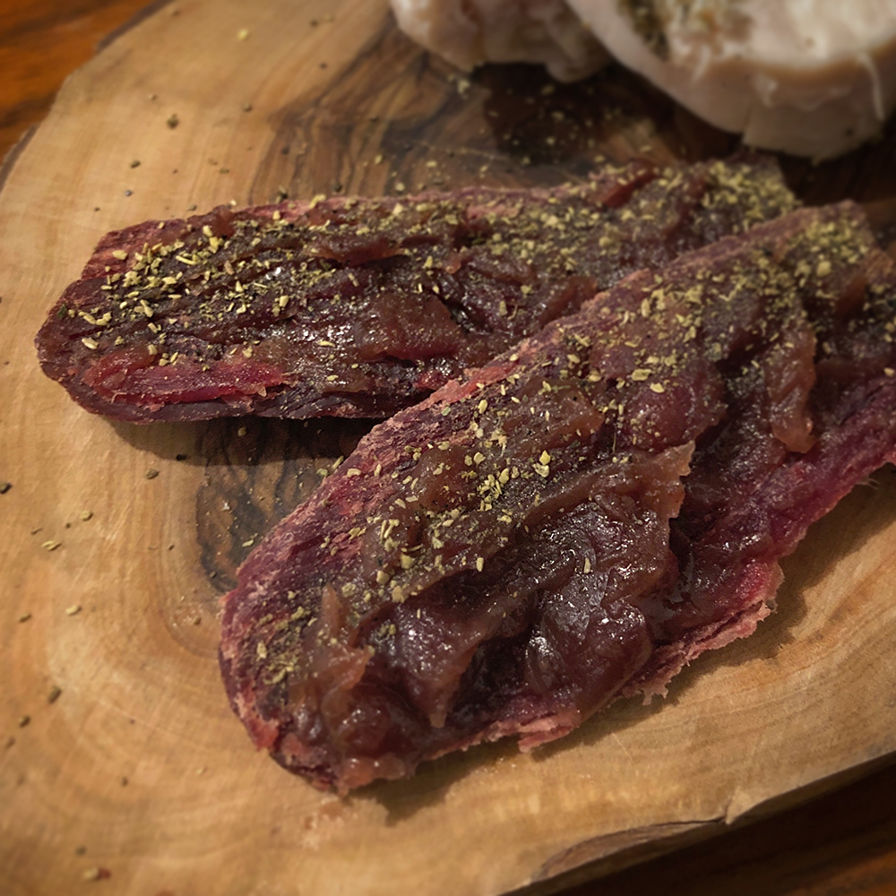 ジャーキーの塩気と肉々しさを小倉あんの甘味とコクが包み込み、