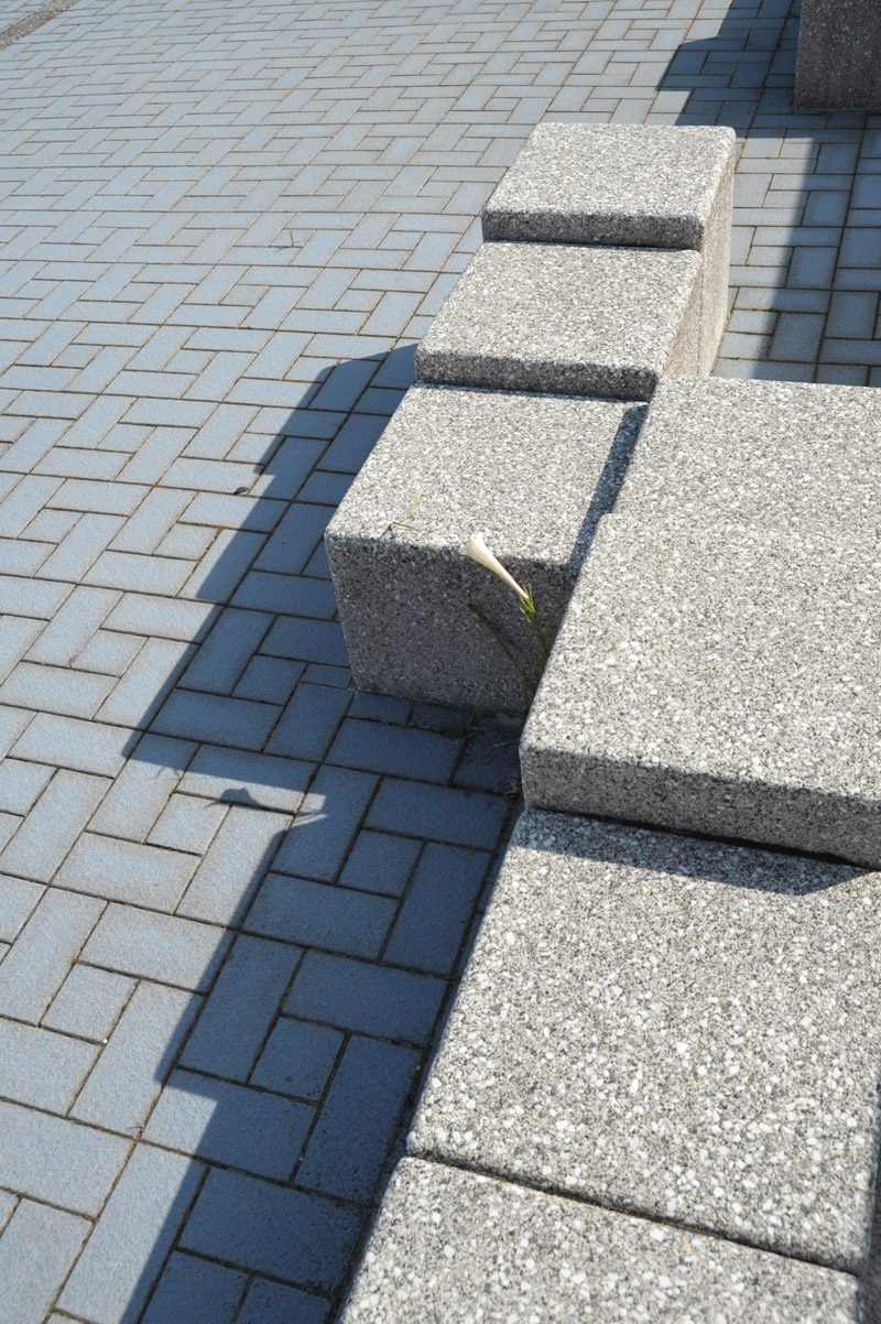 ベンチの横にけなげに顔を出すテッポウユリ。