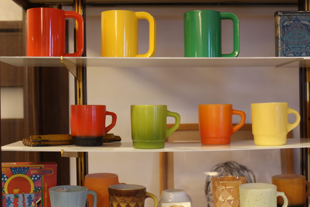 アンティーク好きのシェフのコレクションがカウンター横の棚に可愛く並ぶ。