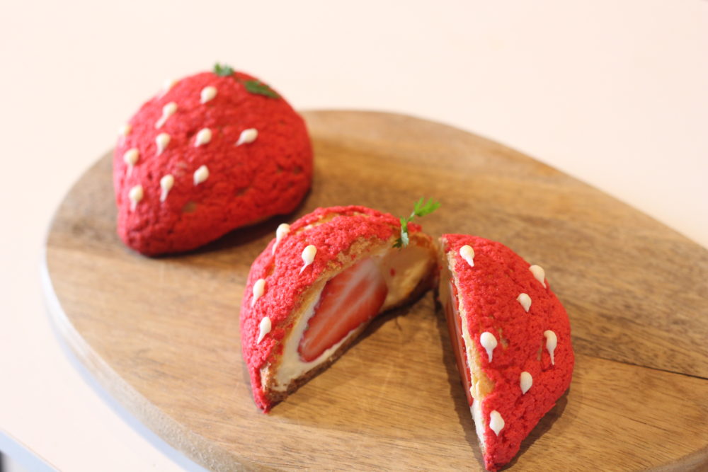 グリナリウム淡路島が自分たちで大切に育てた「淡路の島いちご」を多くの人にお届けしたいと2020年にオープンしたイチゴカフェの看板メニュー。赤いクランブルやホワイトチョコレートをいちごに見立てたその可愛さに思わず顔がほころぶ。中にはカスタード&生クリームのダブルクリームといちごが丸々一粒入っていて、食べ応えも大満足。毎年この時期を待ち遠しく待っているリピーターのファンも多いそう!