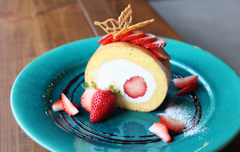 ボリュームたっぷりのロールケーキを華やかに彩るのは山城農園さんのいちご。使用する材料はすべて淡路島産や兵庫県産にするなど地産地消にこだわっている。いちごとの最高のバランスを考え、生クリームは甘さ控えめに、ケーキの生地はコクが出るように卵の量を多めにして完成した。仕上げにちょうちょのランドグシャをそっと乗せて。その美しい見た目にうっとりしながら、ひと口ひと口を大切に食べすすめたくなる。