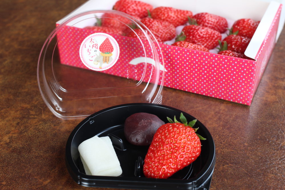 食べる工程までも楽しんでほしいというオーナーの想いで生まれたいちご大福は、手順通りに作ってもよし、そのままのいちごを楽しむべく、一口つまんでから包むもよし、そのフリースタイルが人気で大人も子どもも笑顔に。甘みがつよくてとてもジューシーな「太陽のいちご(紅ほっぺ)」はすぐそばの自農園でつくっており、農園との距離が近いから完熟ギリギリまで育てることができる。
