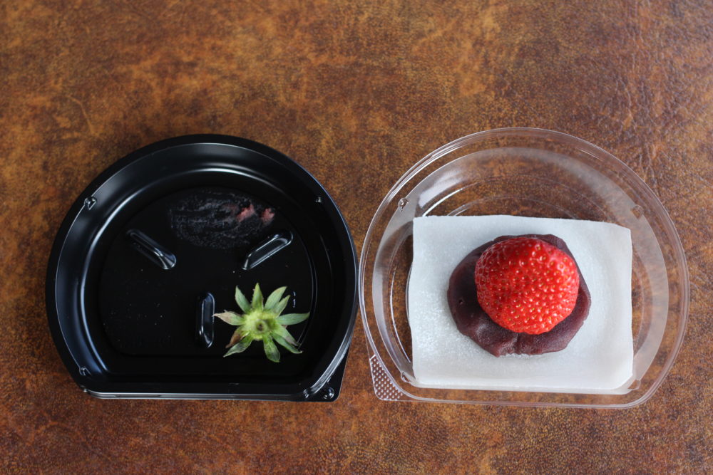 1.フタをお皿代わりにして、求肥→あんこ→いちごの順に重ねる(ヘタを取るのを忘れずに)