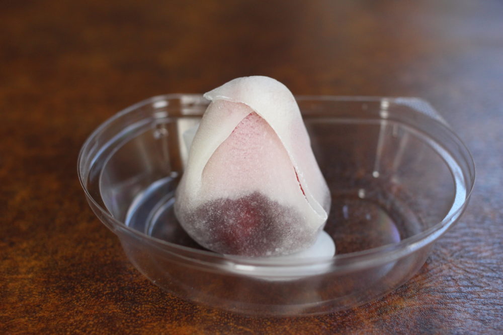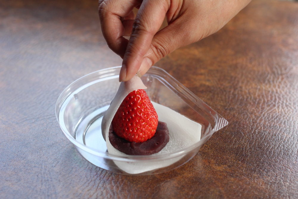 2.いちごを求肥で包む(求肥がすごく伸びる!)