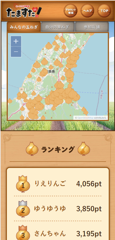 いつもなにげなく食べていた淡路島玉ねぎの底力を感じました。甘いね、旨いね〜。意外な食べ方やお店の人とのあったかい交流などうれしい発見も多かったです。また、ポイントを増やすゲームや様々なボーナスポイントもあり、ついランキング上位(20位内は発表される)になりたくてポイ活を楽しむ日々…ちなみに私は現在トータル87ポイント、目指せ、上位!!
