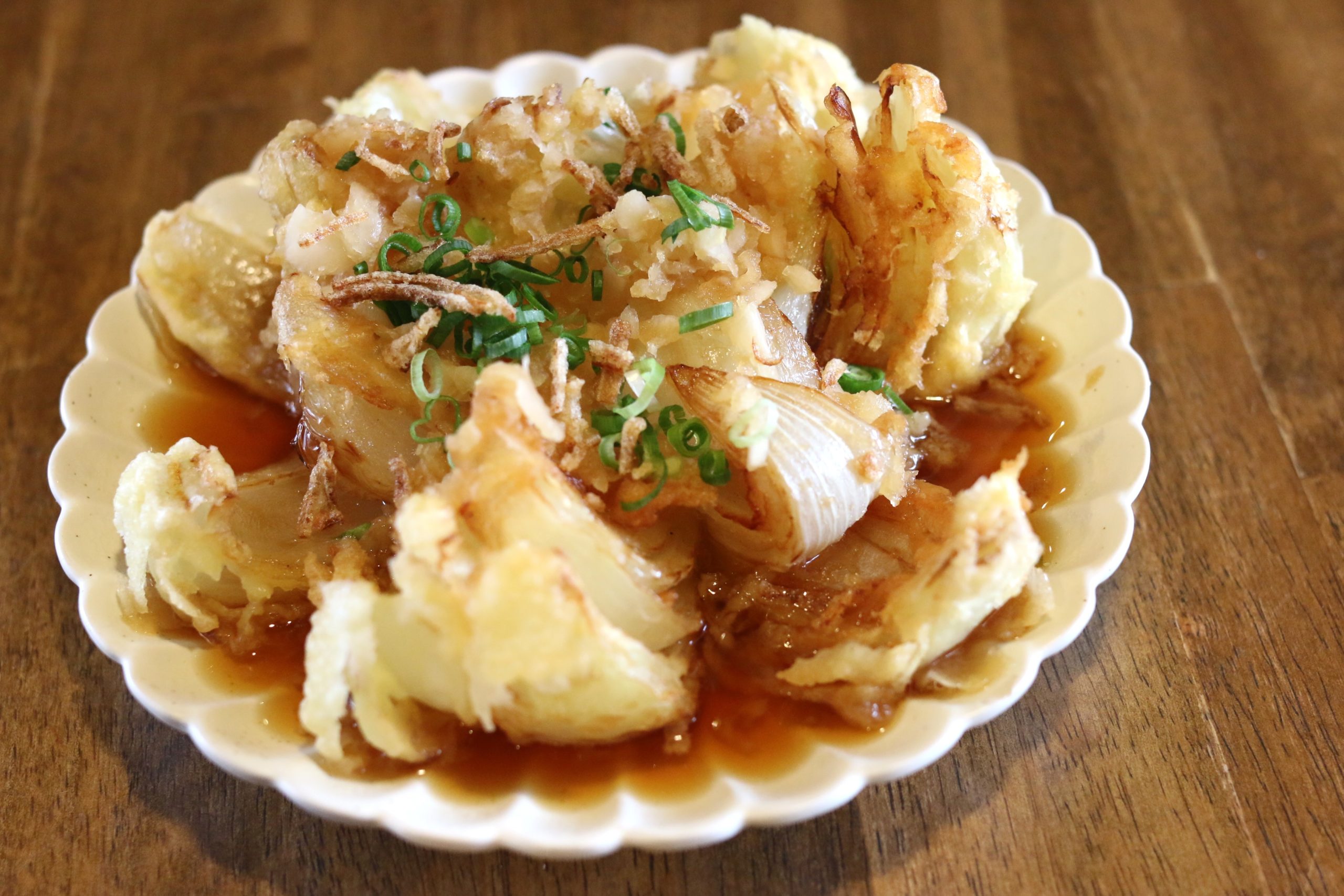 油で揚げることで玉ねぎの甘みが増し、香ばしい風味とカリッとした食感が加わり、サク、トロ~、ジュワーがたまらない。揚げたてアツアツはとにかく最高。
