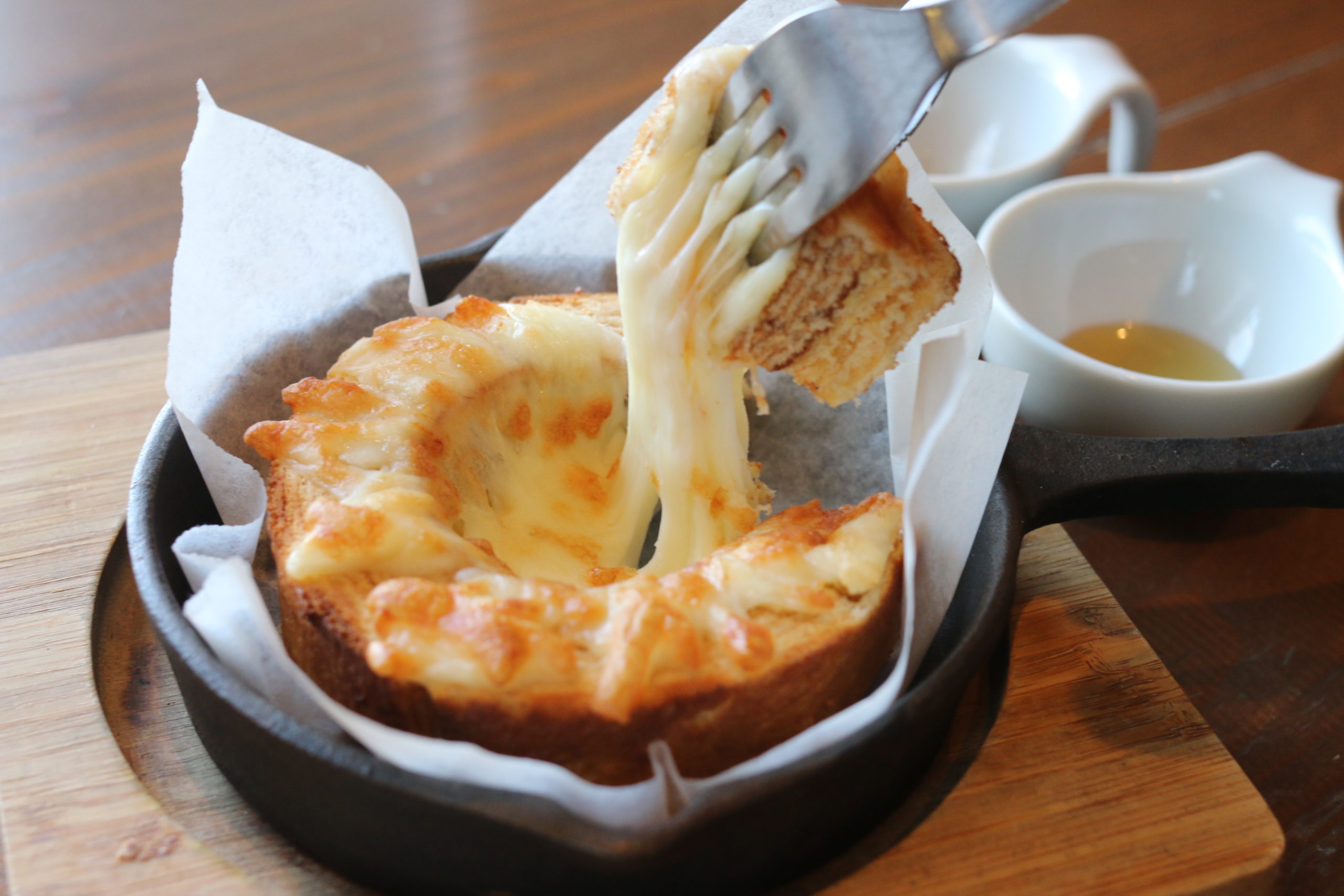 おやつのような、軽食のような?運ばれてきた熱々のスキレットの上には、チーズをたっぷりかけてオーブンで焼き上げた「玉ねぎばぁむ」。