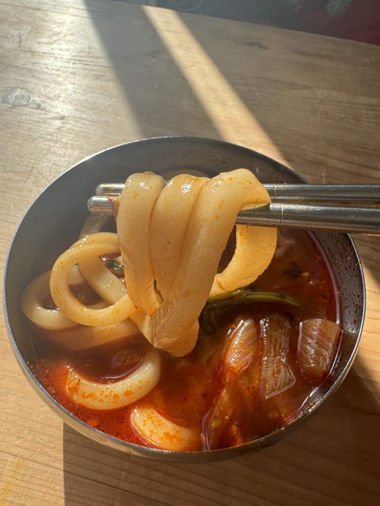 〆にはうどんがついて最後までアツアツグルメを満喫。余ったスープは持ち帰る方も。