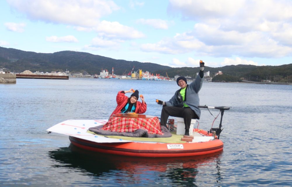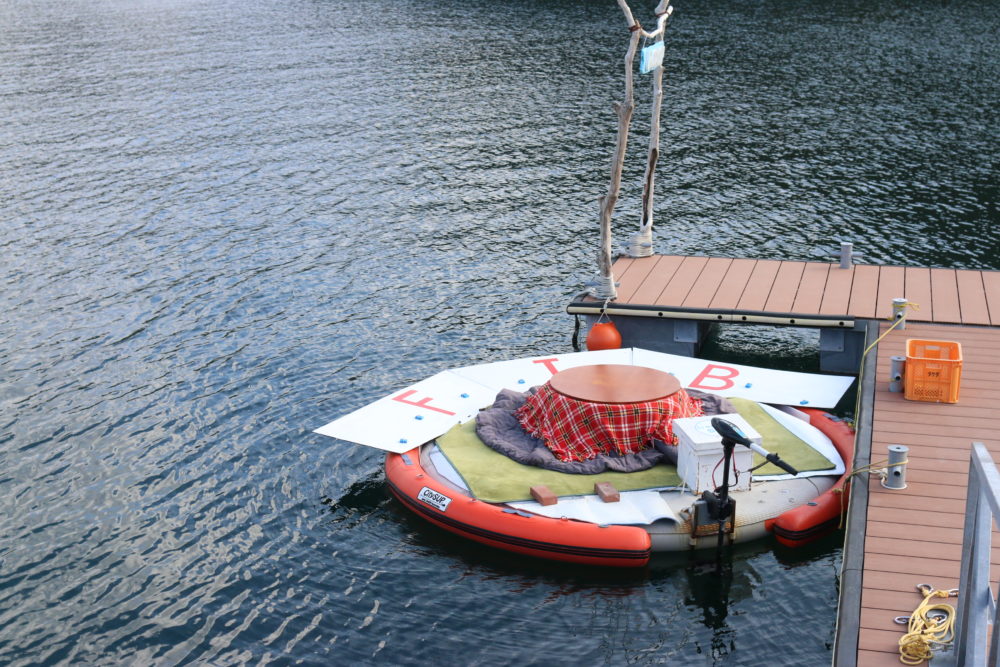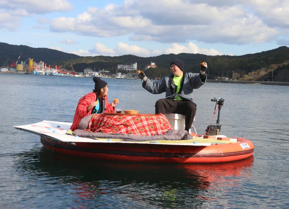 エンジン付きの円形ボートに設置されたこたつに入りながらのんびり楽しむ海旅はいかが