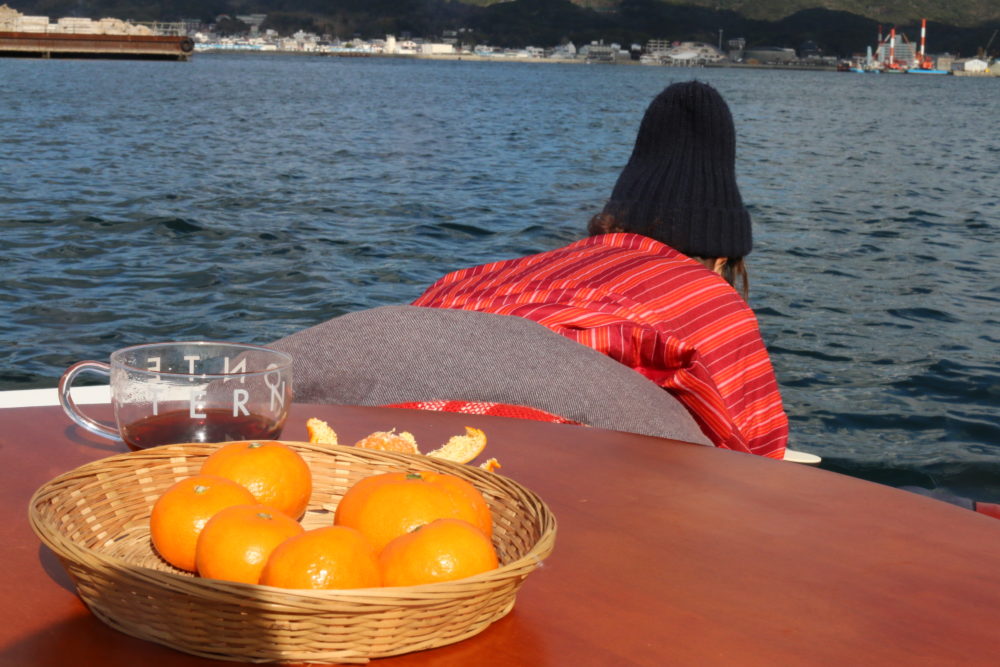 『こたつ』というワードに惹かれて取材交渉するも冬の海の寒さに直前までオロオロ。いざ体験すると豆炭の温かさと、はんてんの防寒力の高さで暖かく過ごせほっこり安らぎました。冬ならではの澄んだ海と空をこたつに入りながら満喫しましょう。寒さを吹き飛ばす楽しさあり!