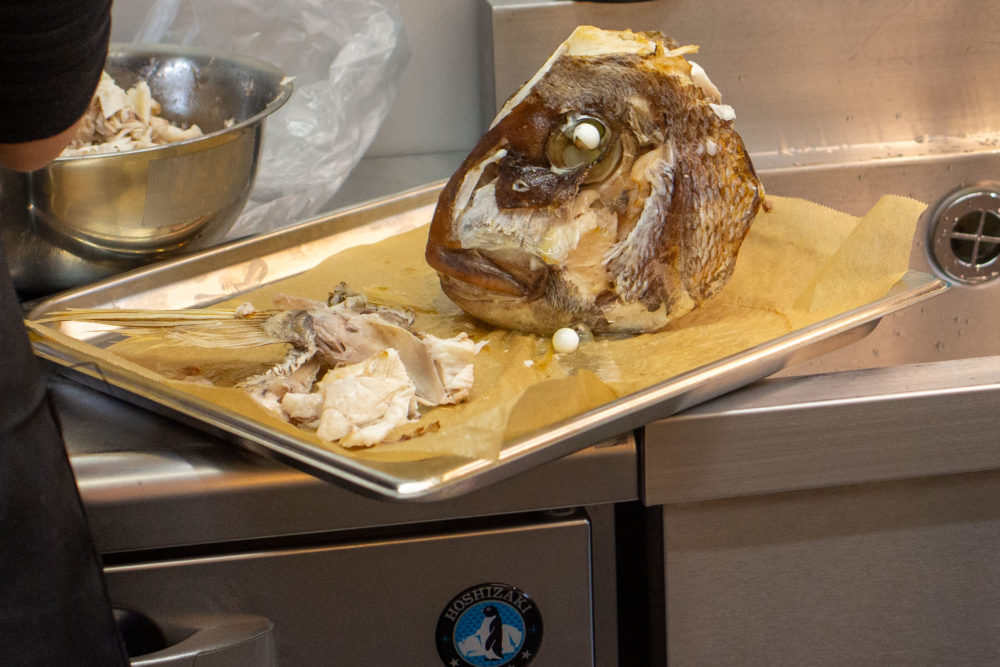 鯛のカマについている身をほぐしているところ。その日一番の大物のお頭は、直径20㎝近くあって大迫力です。