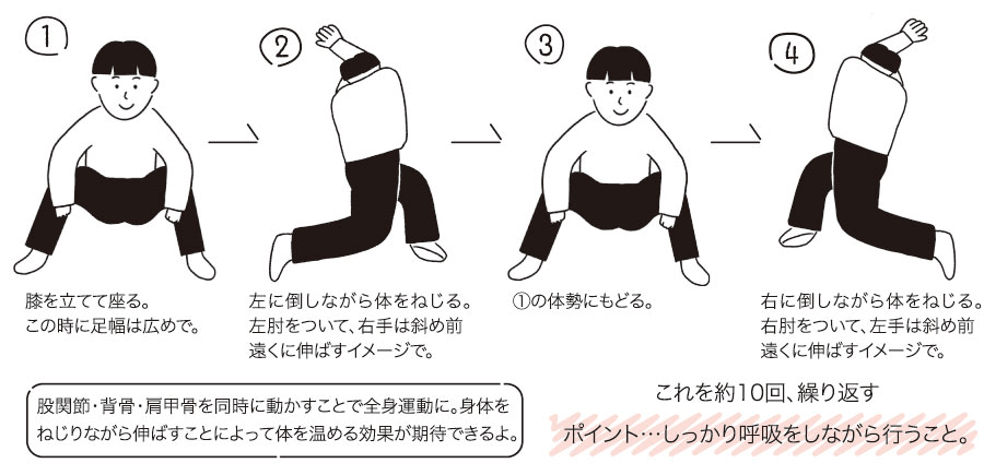 カンタンだけどしっかり温まるストレッチを教えてもらったよ。ぜひやってみよう!