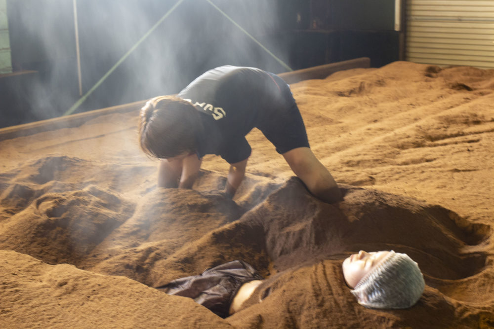 米ぬかの中に入り、ぬかに含まれる微生物から発生する自然熱で体を温める温浴法。Sun燦は淡路島産の脱脂されていない新鮮な米ぬかを100%使用しています。