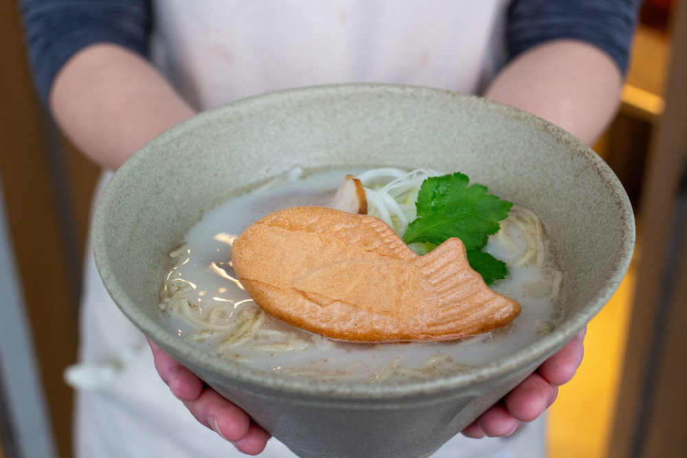 鳴門海峡の荒波にもまれ育った天然の鯛のアラでとったスープに、これまた鯛と薬味などで作った香油を加えた、鯛の旨味をとことん堪能できる一杯。麺はストレート細麺で、チャーシューは淡路島のえびすもち豚を使用。可愛い最中の中には、鯛のほぐし身が入り、スープにといて麺に絡めれば鯛をより一層感じられます。
