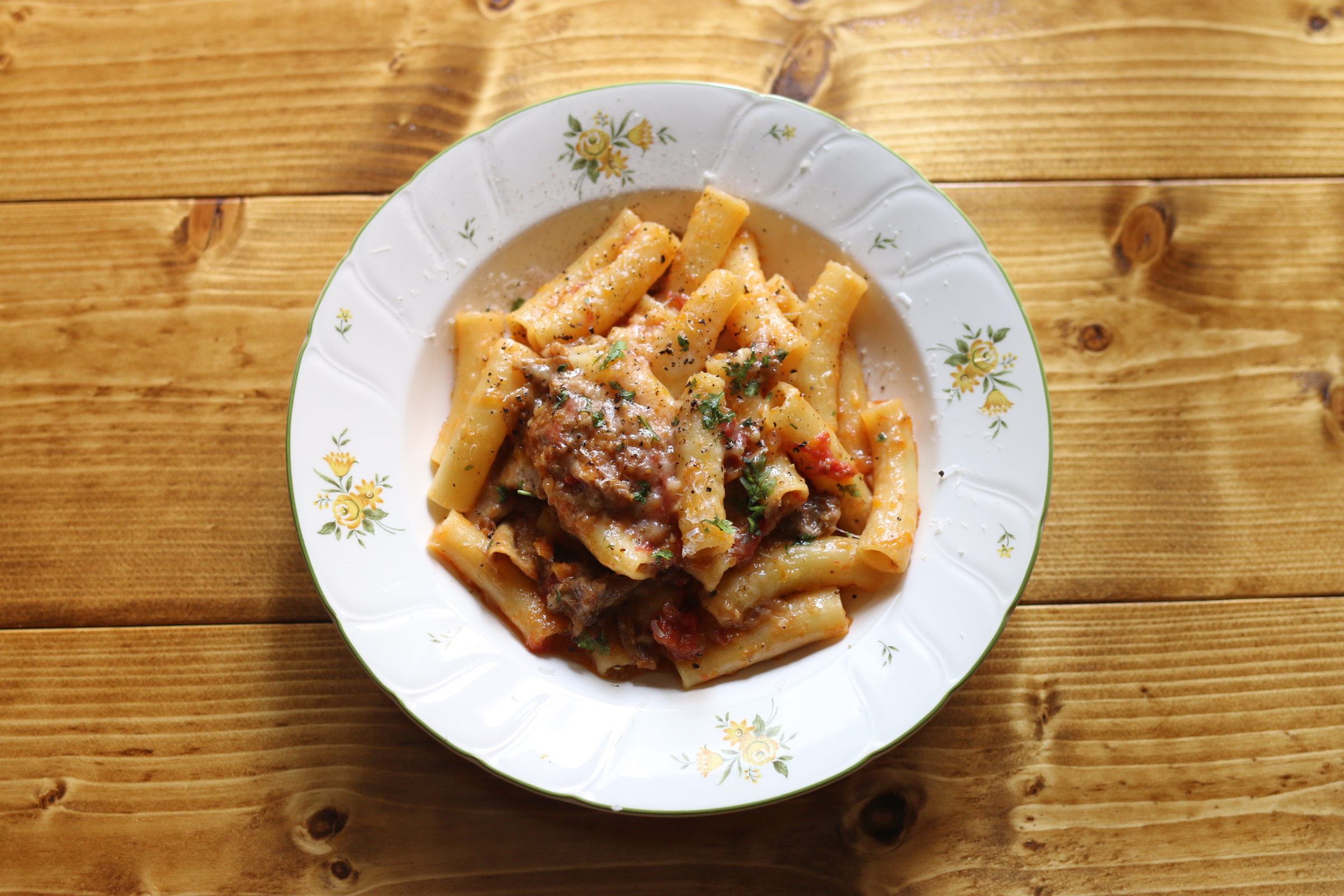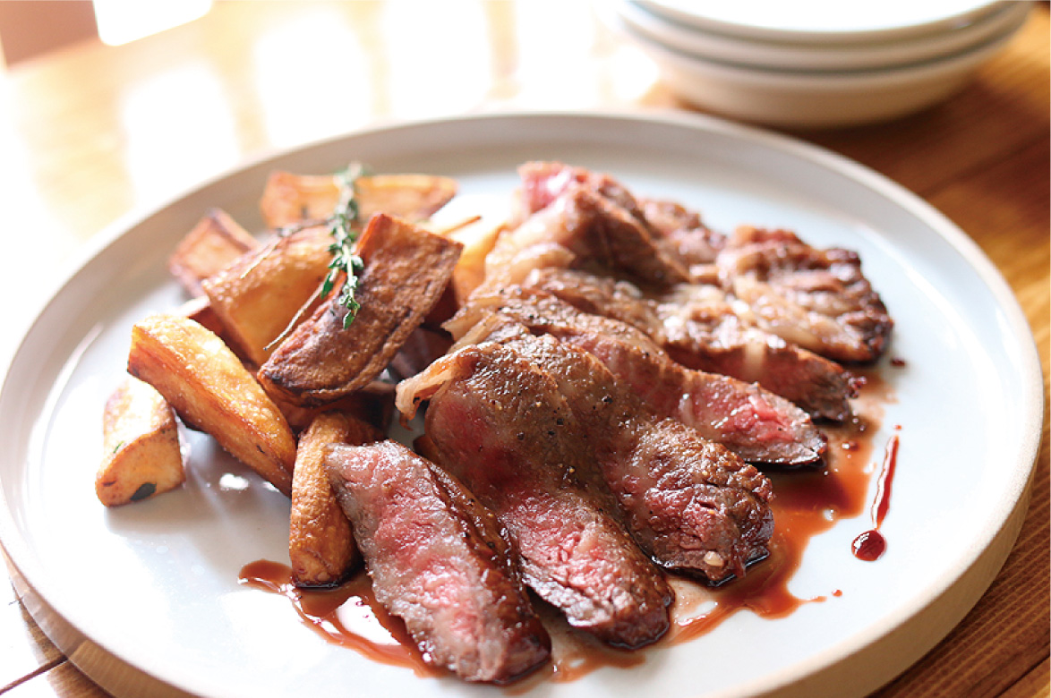 昨年、期間限定のチャレンジショップで人気を博したETHICAが、満を持してレトロこみちに本格オープン。地域に根ざした店を目指し、季節の食材が楽しめ、カジュアルに通えるイタリアンがコンセプト。できる限り手作りにこだわり、料理はもちろん、その想いはお店の内装まで。木のぬくもりがあったかいくつろげる空間となっている。取材時は、ランチの定番、牛すじのトマト煮込みパスタ。幼い頃のおふくろの味をイタリアンで表現したという、一見濃厚そうに見えて、ほっとするやさしい味わい。もうひとつは、夜のアラカルトで、45日熟成の淡路和牛リブロースのステーキ。肉の旨味が際立つ、必ずオーダーしたい一品だ。